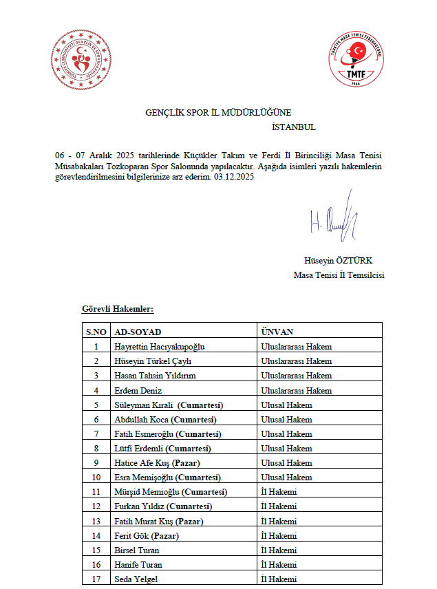 06-07 Aralık 2025 tarihlerinde Tozkoparan Spor salonunda düzenlenecek olan İstanbul Küçükler Takım ve Ferdi İl Birinciliği Hakem Görevlendirme Listesi aşağıda yer almaktadır.
